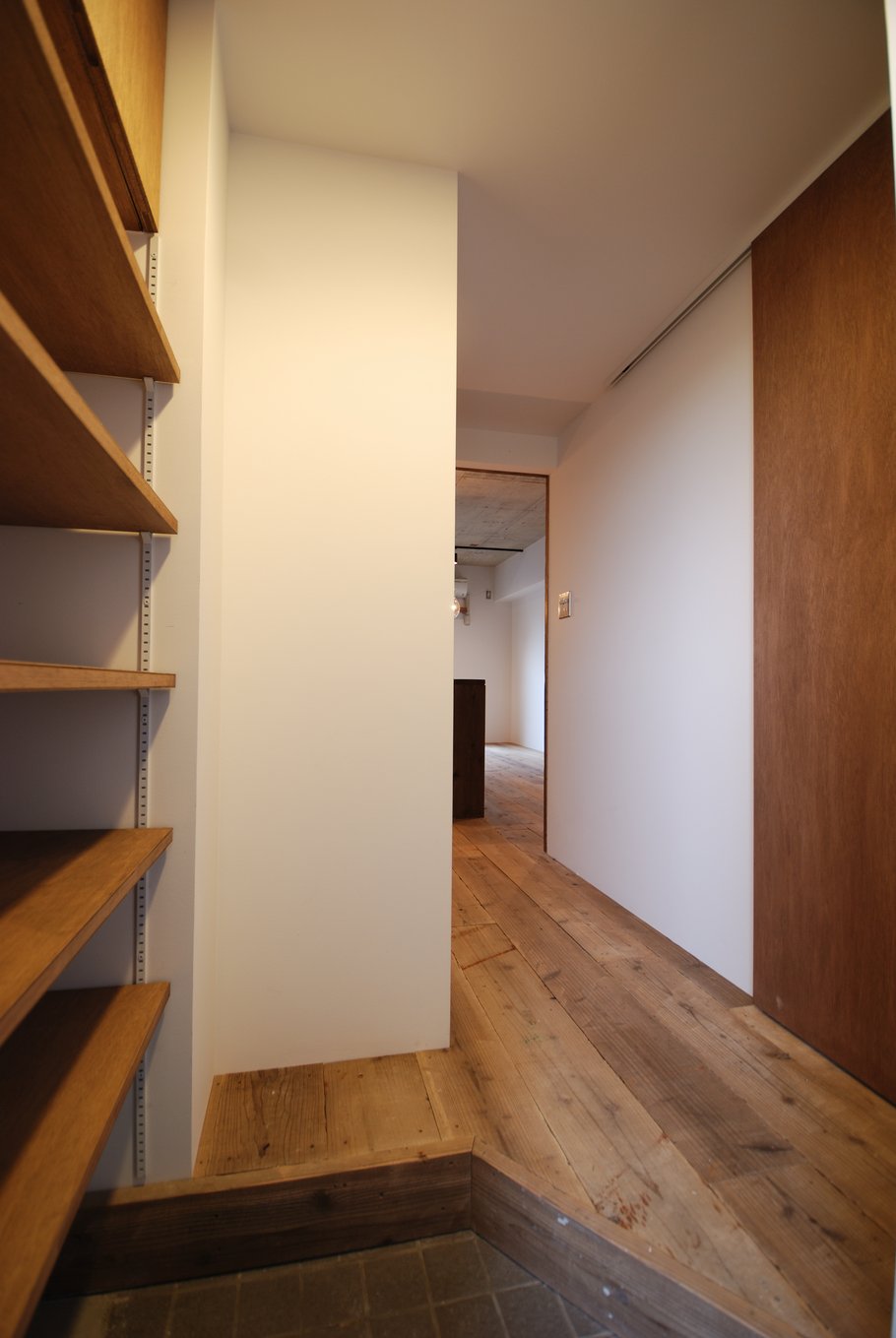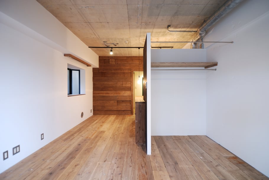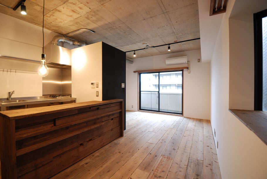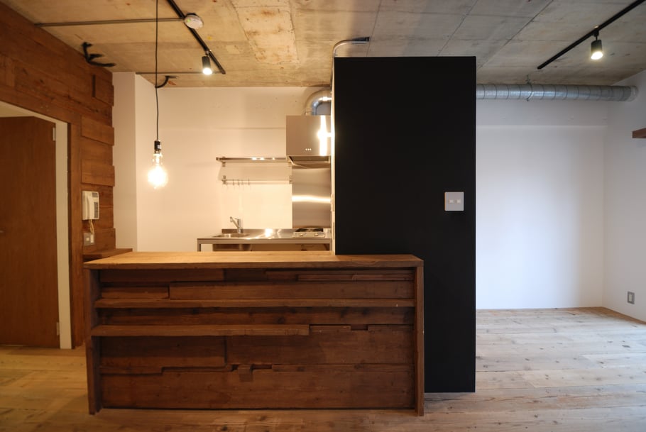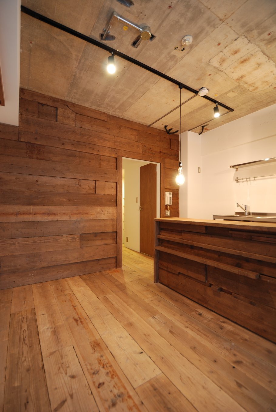 リズム株式会社が提供する、お気に入りのカフェのような居心地のよさを自宅で味わえるリノベーションシリーズ「iCafe」。 「自分だけのカフェ空間」をコンセプトに掲げたワンルームマンションとは思えない個性的な空間。粗さと心地よさが同居した部屋となっている。広めのワンルームは、カウンターと高さ2mほどの低めの壁面で緩やかにゾーン分けされている。また壁面の一部に黒板塗装を施したり、床と同材の足場板張りとするなど空間のアクセントにもこだわった部屋となっている。