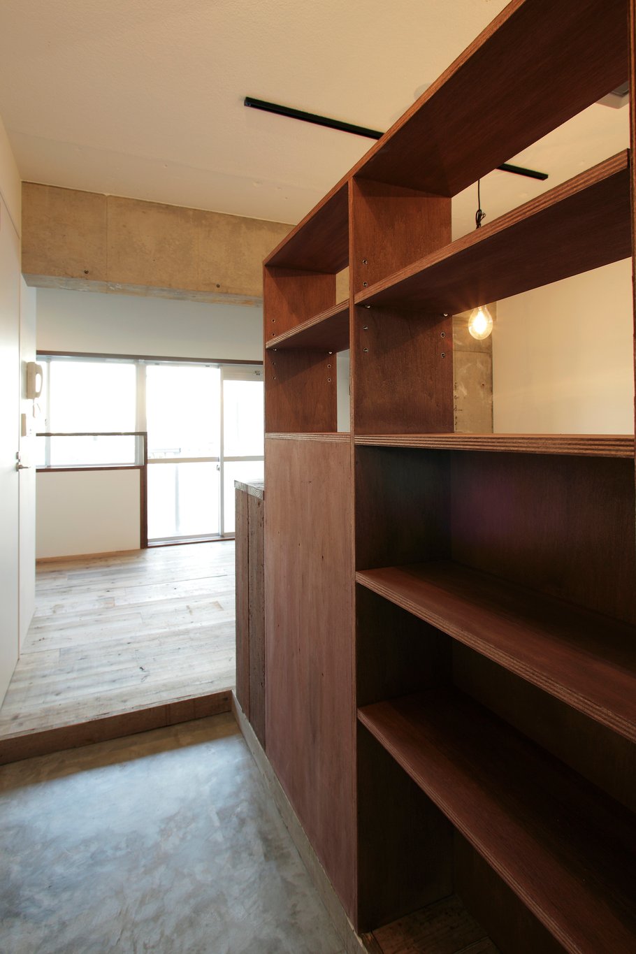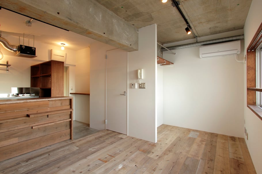 撤去できない構造壁とその開口垂壁を、あえて現しにしてデザイン的に強調。構造壁を中心に天井塗装を塗り分けするなど、緩やかにゾーンとしての違いも出している。ワンルームにしては広めの玄関も空間に贅沢な印象を与えている。