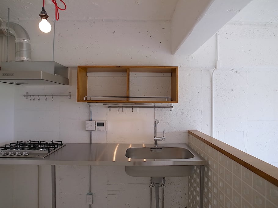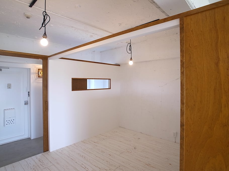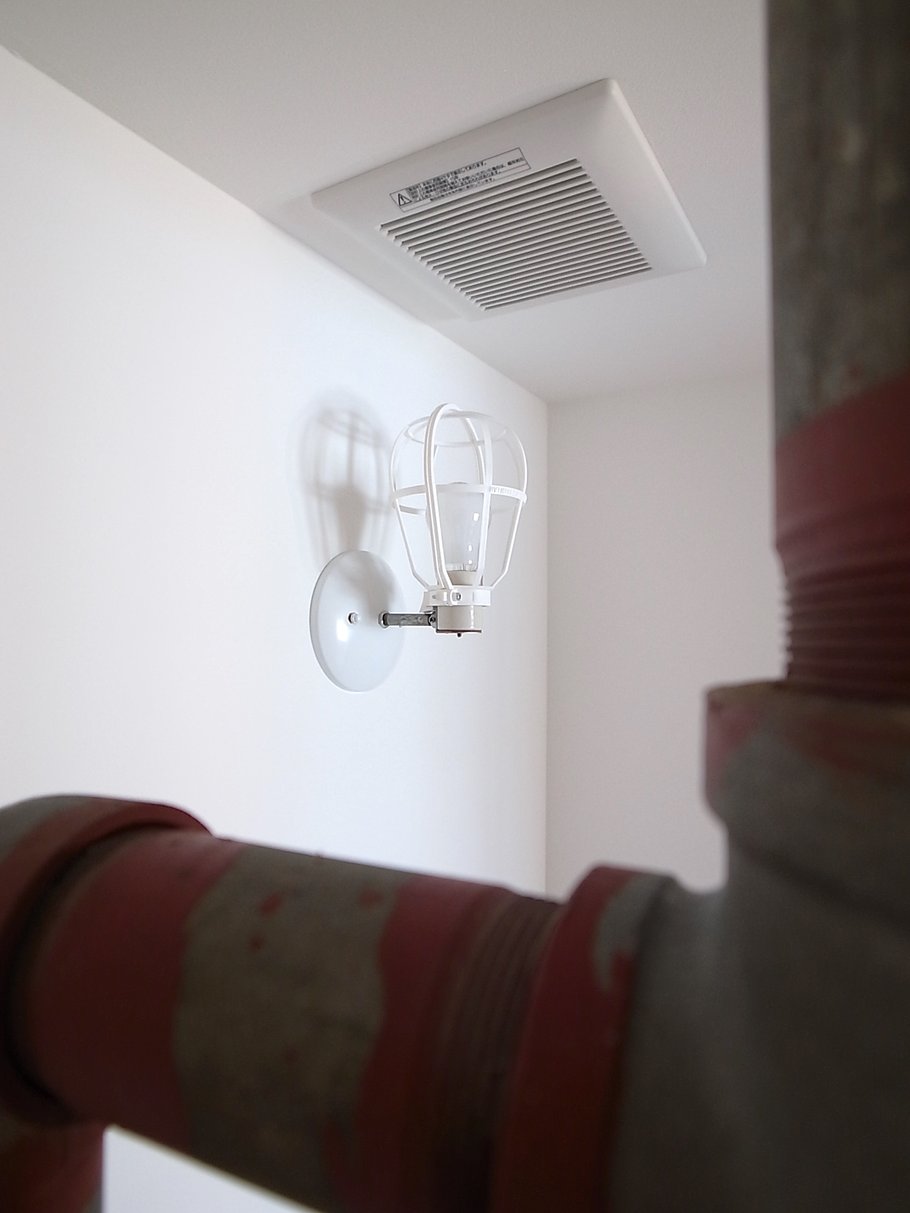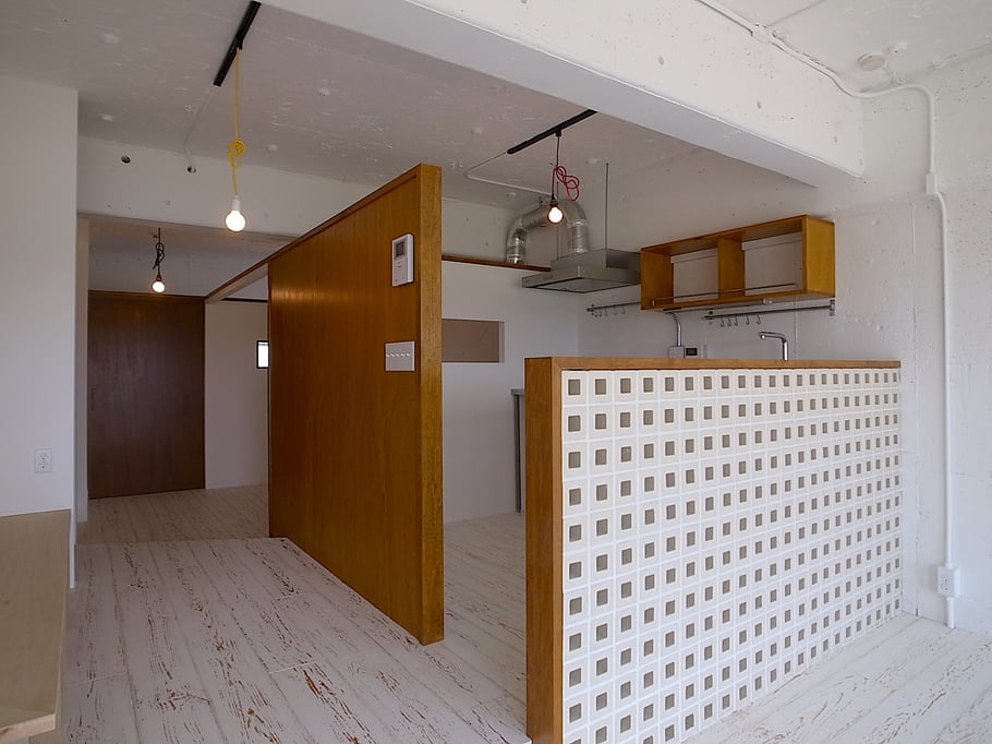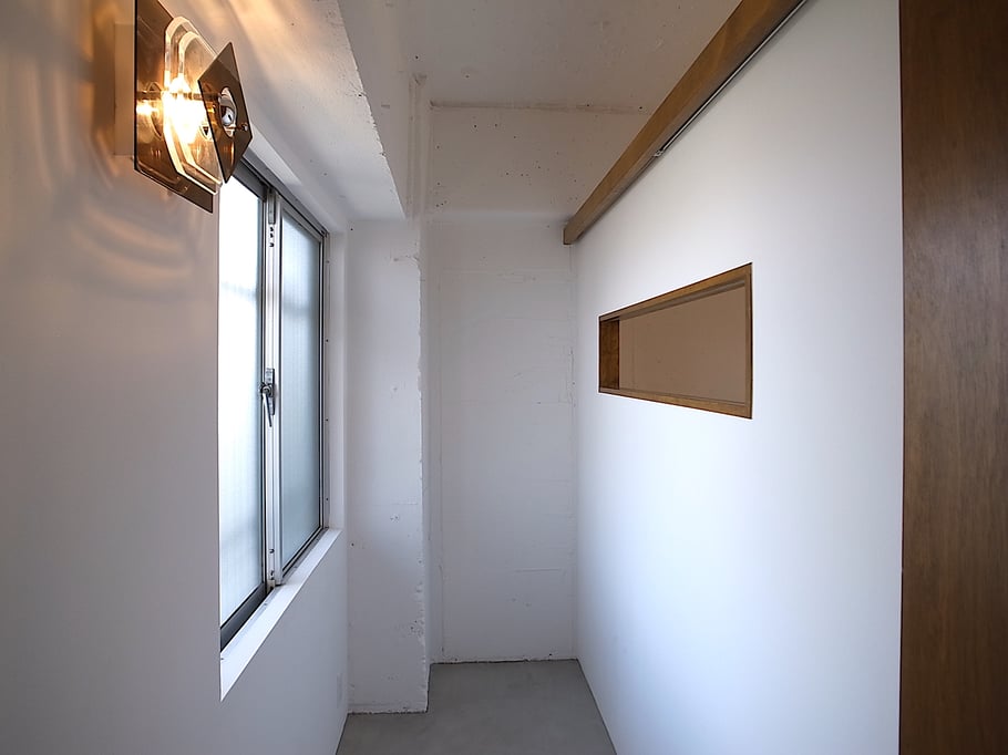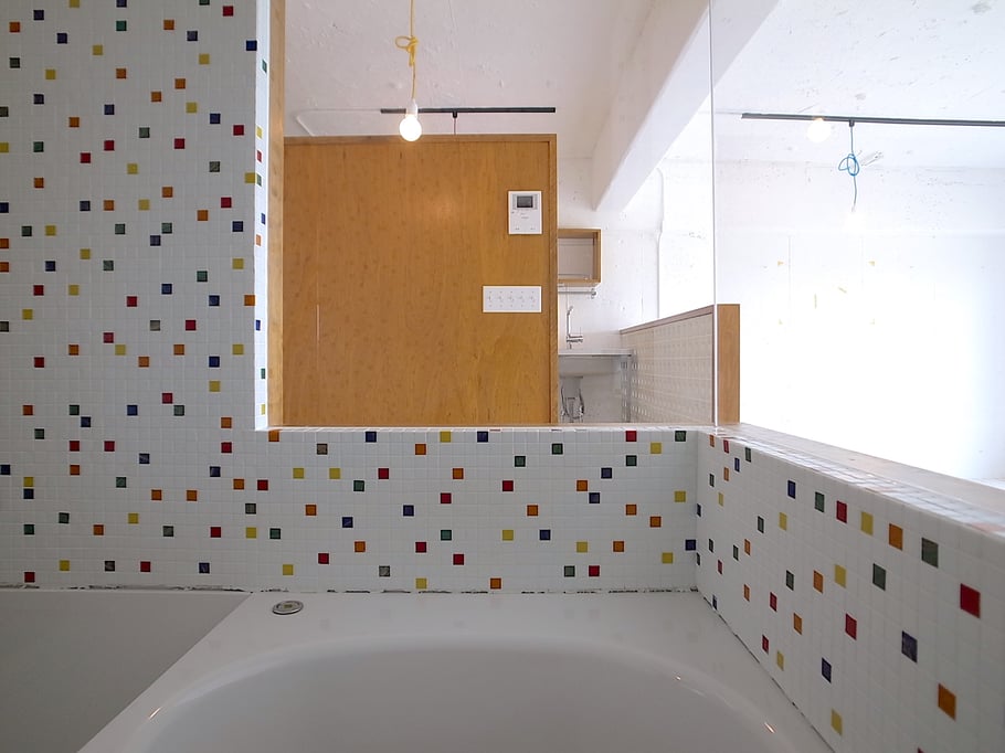 寝室やキッチンは天井まで届かない壁でゆるやかにゾーンを区切り、全体として非常に風通しも良く気持ちのいい空間となっている。ガラス張りの浴室は、川沿いの眺めを望むことができ非常に開放的で、タイルは施主自ら海外から買い付けたこだわりのガラスモザイク。有孔ブロック等の素材や照明にもこだわり抜いた家である。