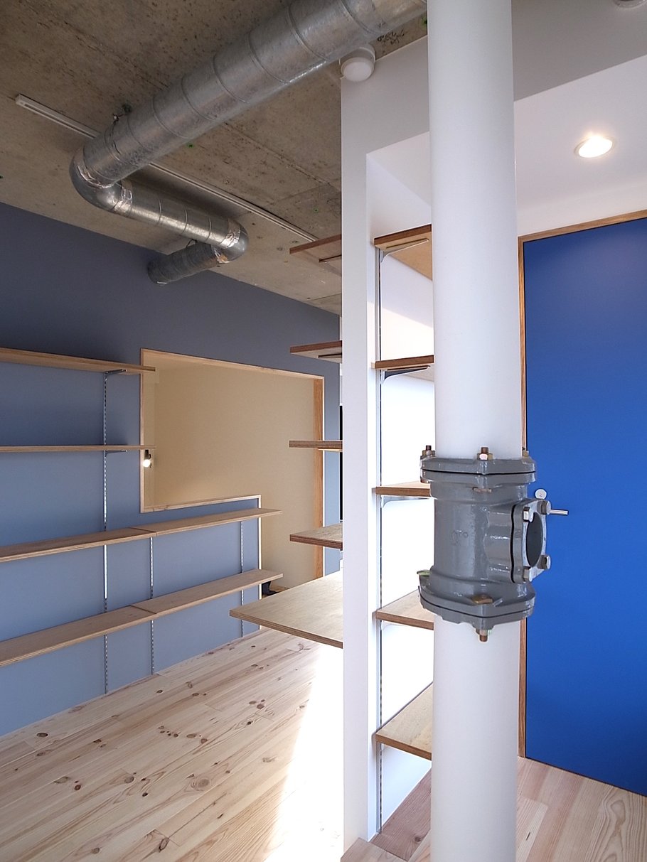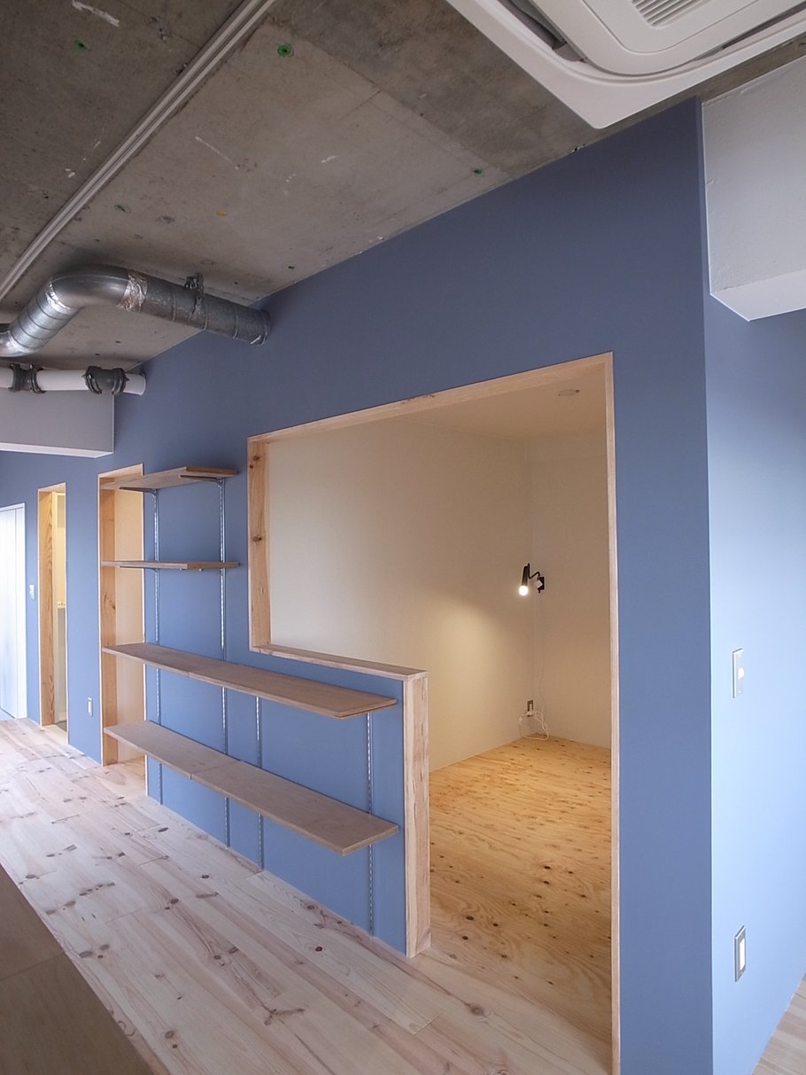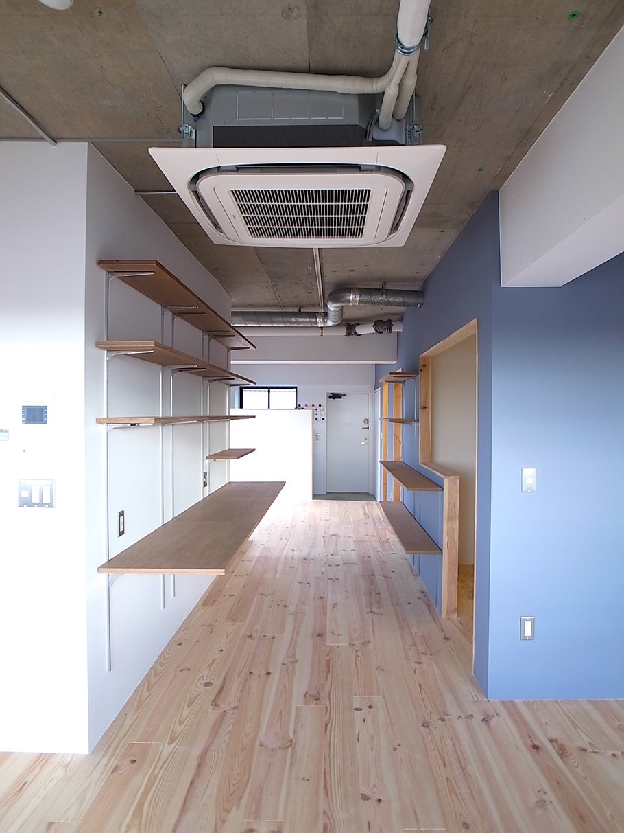 玄関から続く広い廊下と、窓に面した明るいキッチンがとても印象に残る。以前は玄関から狭く閉じられていた廊下も、大胆に広げることで風通しの良い居住空間になっている。部屋のほぼ中央にあった浴室も、共用廊下側に大胆に移動することで今までなかった採光と広さを得ることができた。
