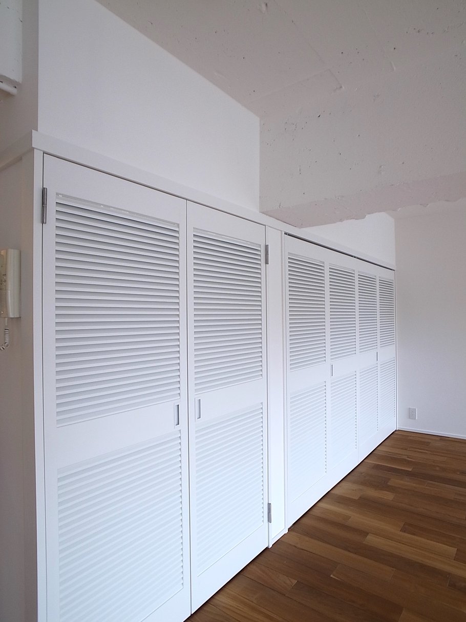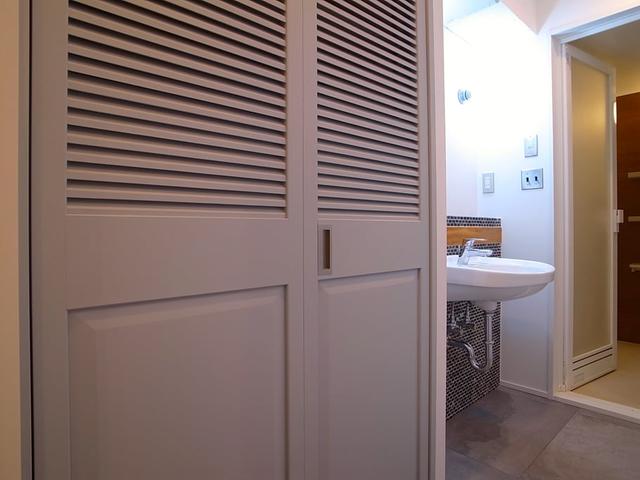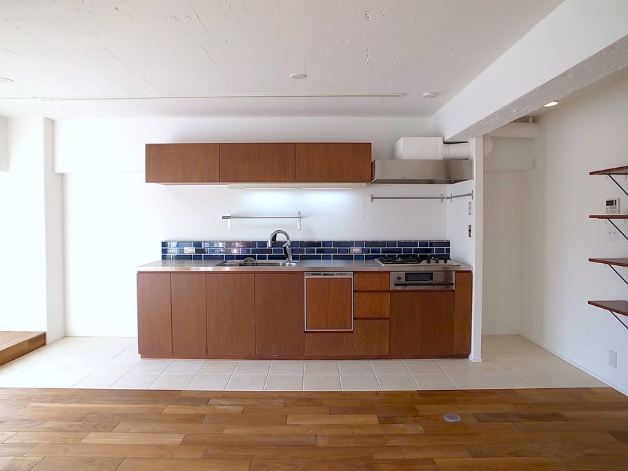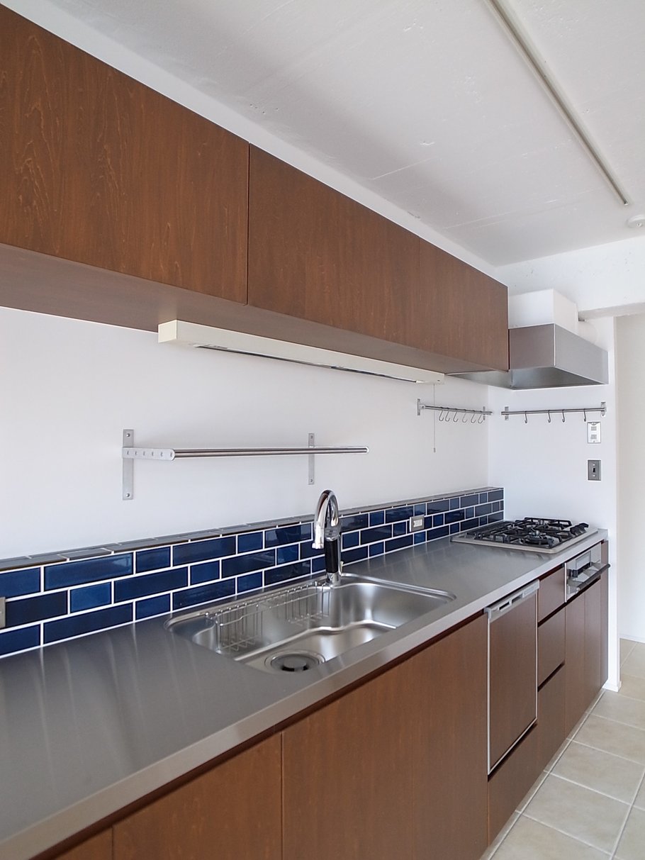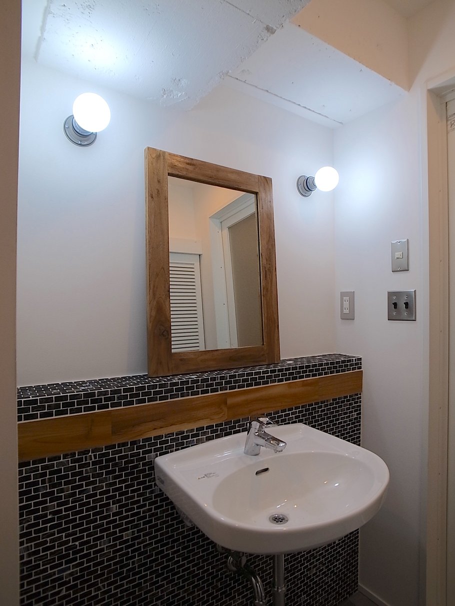 広いリビングに配置された3mを超える大きなキッチンが印象的な空間に、チークの無垢フローリング、躯体現しの天井、黒皮塗装のスチールドア等をとてもセンス良く組み合わせている。洗面やトイレには少しレトロな雰囲気を出すような素材を選定した。