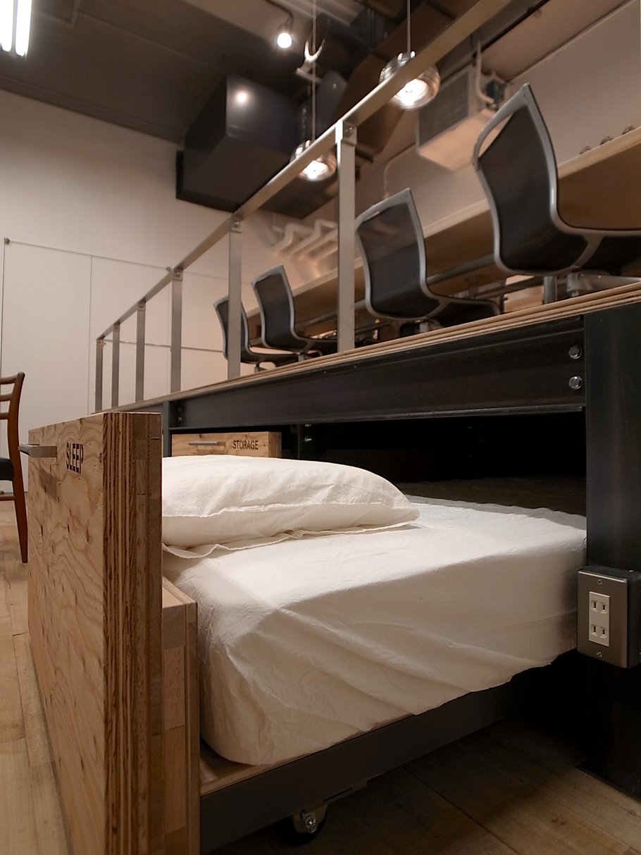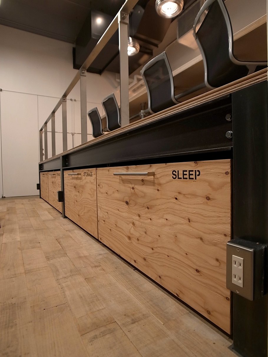 このスタジオは、打合せや作業の場だけではなく、海外から招聘したアーティストのレジデンスや様々なワークショップなど、いろいろなカタチで活用されている。考えながら創り、創りながら考えるこの場は、天井高を活かしたファクトリーのような空間をイメージ。