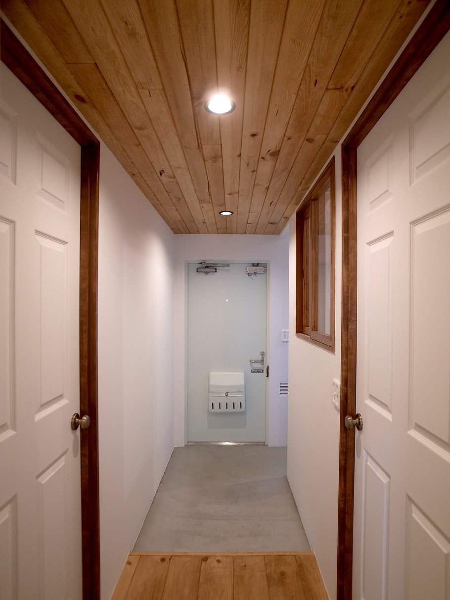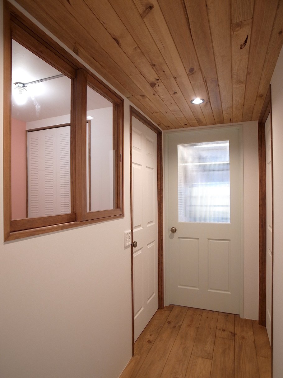 玄関からリビングまでの廊下には床同様にブライワックスで塗装した天井材を使用。リビングドアを隔てた空間のメリハリもある。