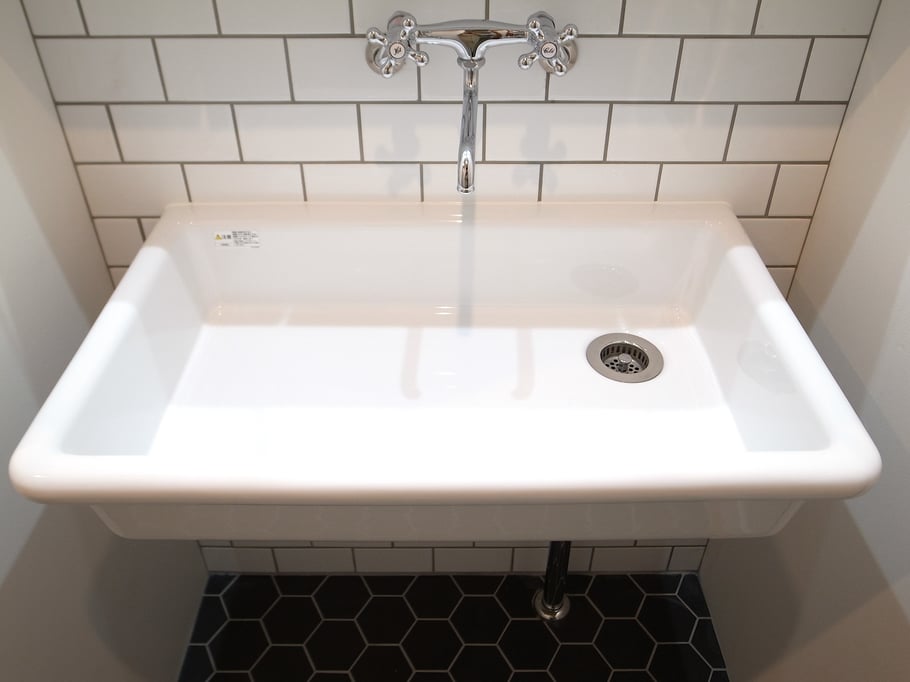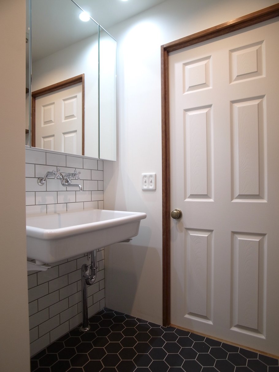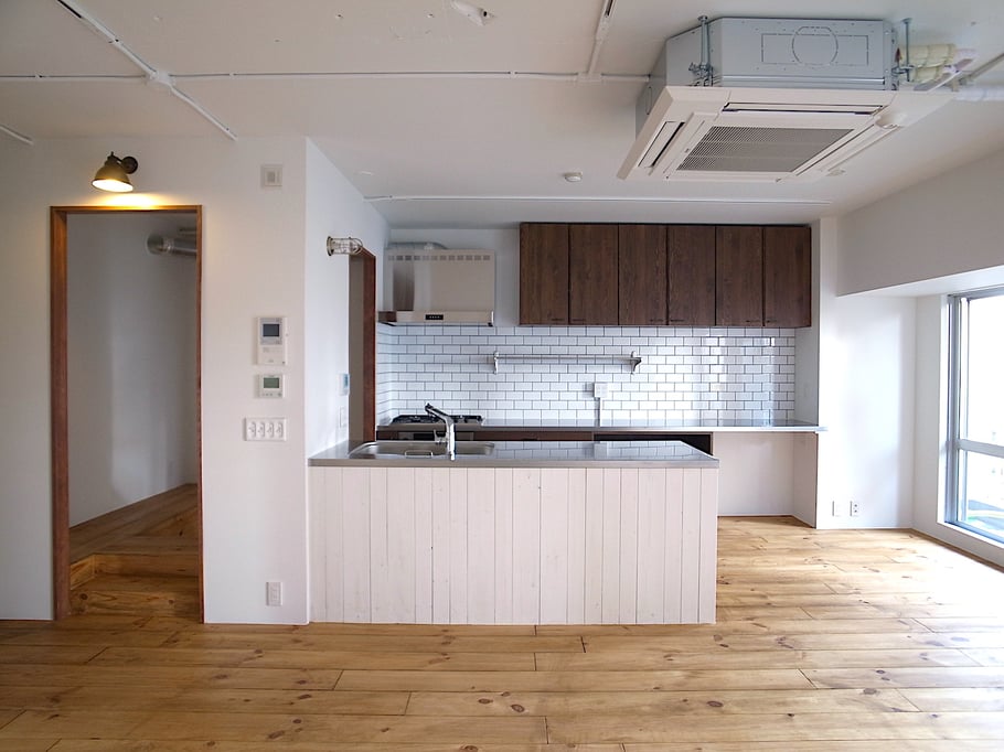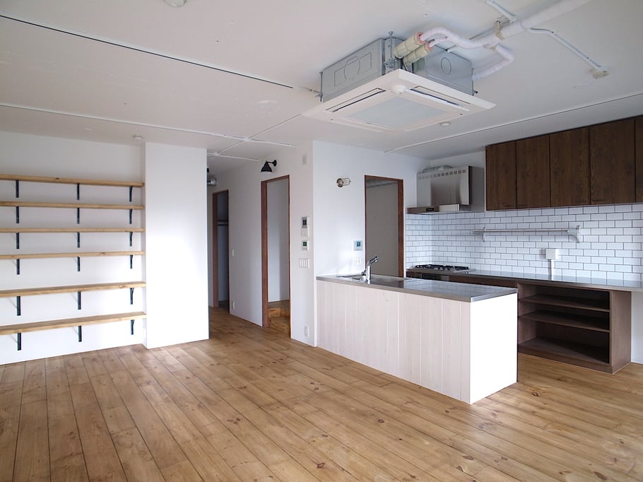 幅の広いパイン材のフローリングを、施主自らブライワックスで塗装した明るく広いLDK。実験用のシンクやサブウェイタイル、陶磁器のスイッチプレートを使うなど、水廻りは素材の組み合わせにもこだわっている。