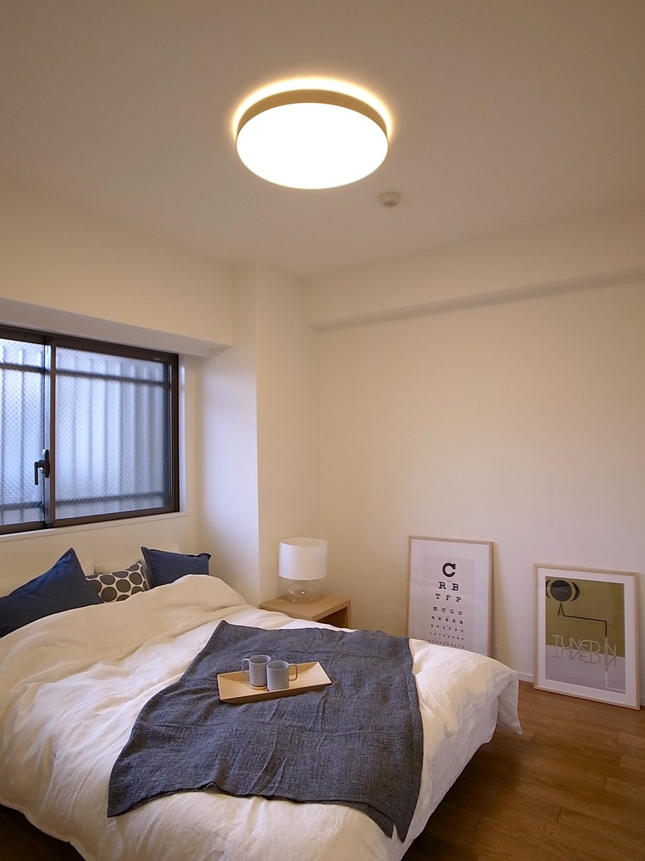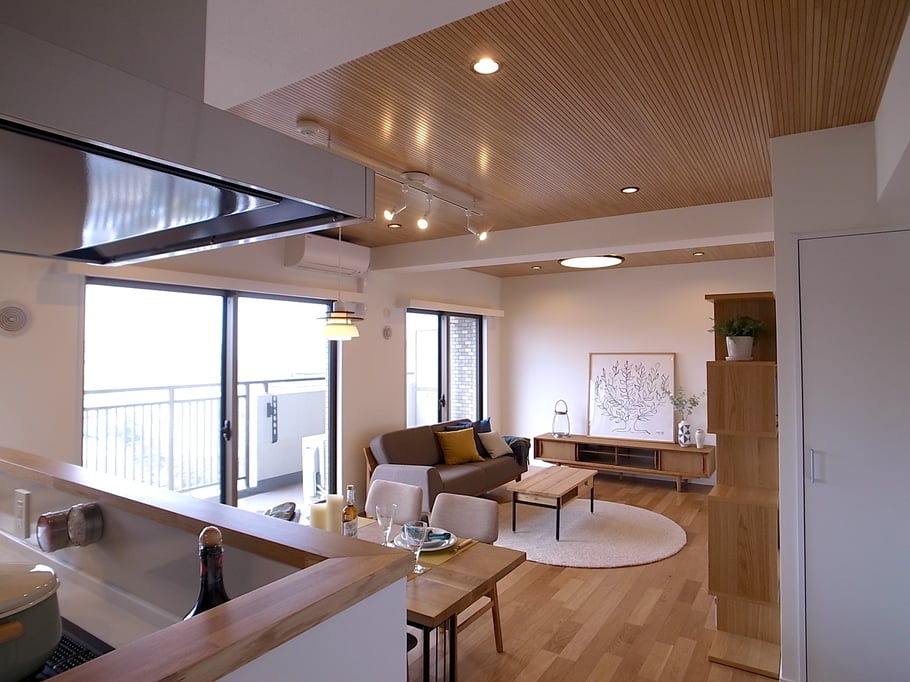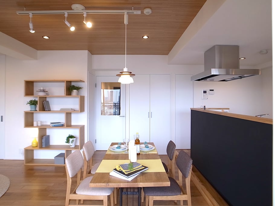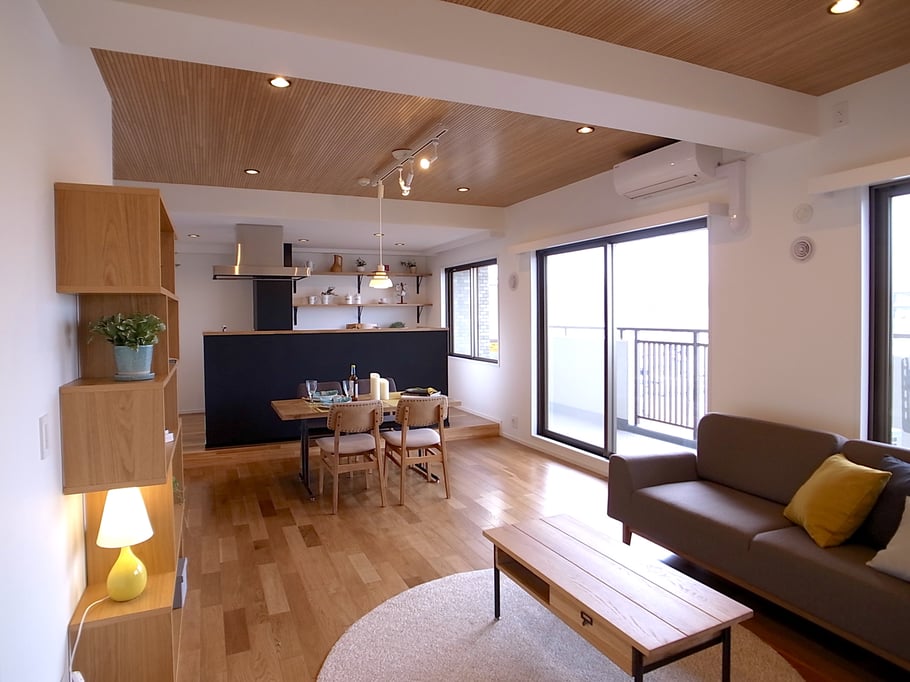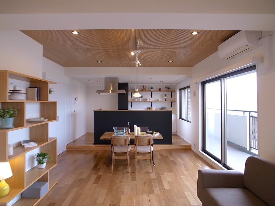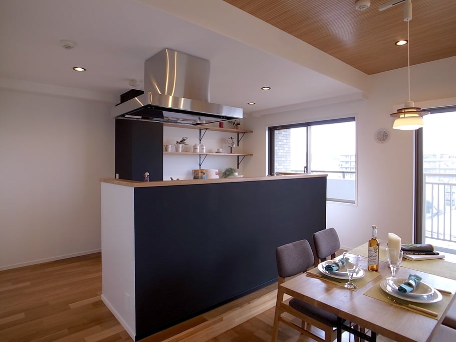 窓が多く開放感のあるLDKは、キッチンから全体を見渡せるような配置になっている。既存のプランや設備を活かしつつ、天井にリブ材を貼ったり、黒板塗装でキッチンとパイプスペースを囲ったりと、個性とメリハリのある空間になっている。
