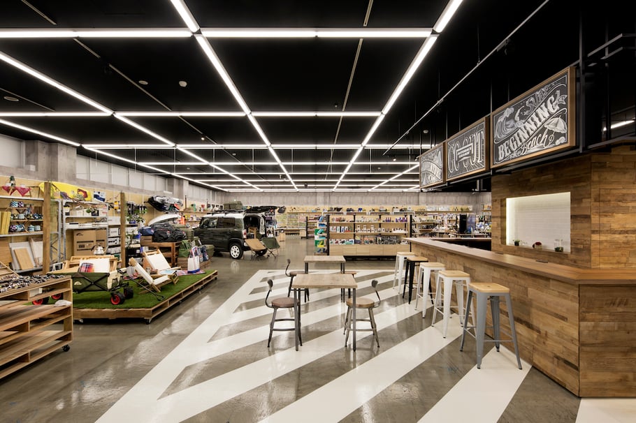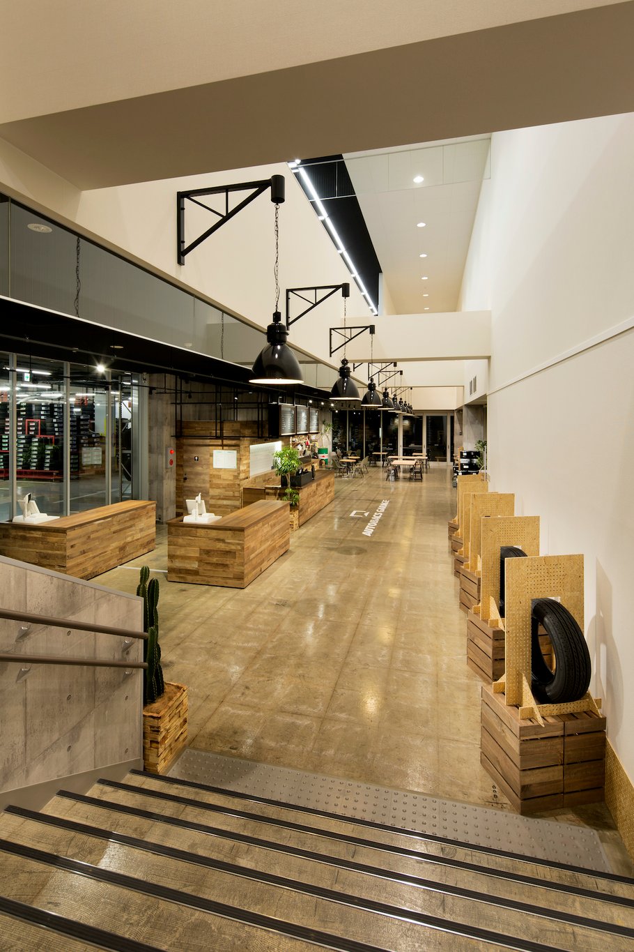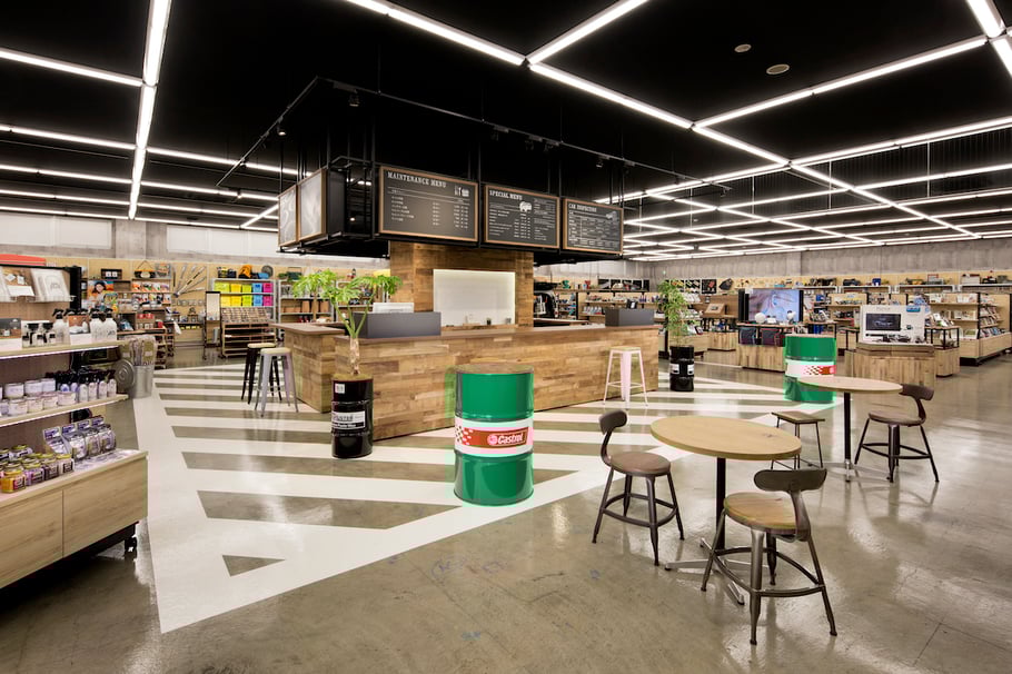 既存の店舗から商品構成も含め大幅リニューアルした店舗は、ガレージカフェをイメージし、あまり車に詳しくないユーザー層でも気軽に来店しやすくなっている。オフィス・エコーでは店舗づくりのコンセプトおよび企画から設計・デザインディレクション、インテリア計画を担当。