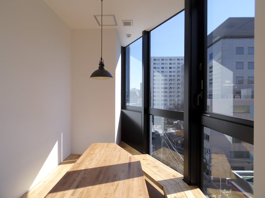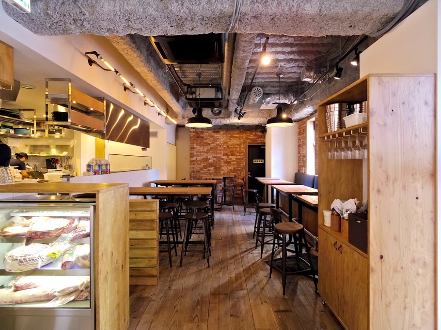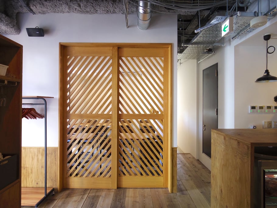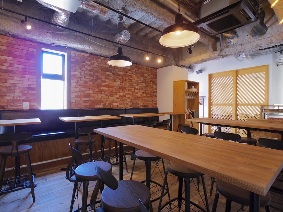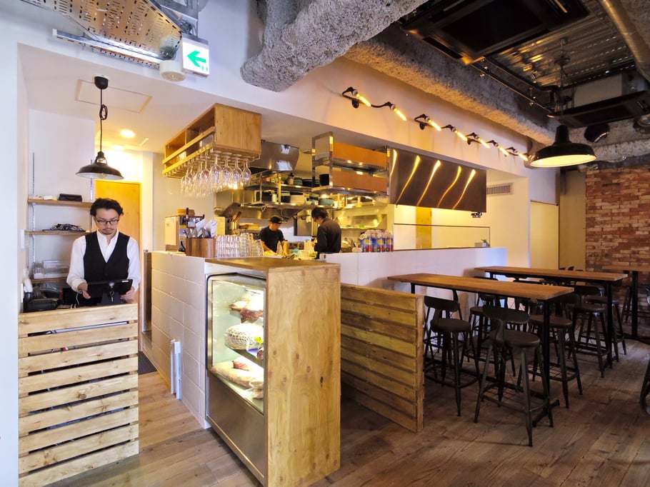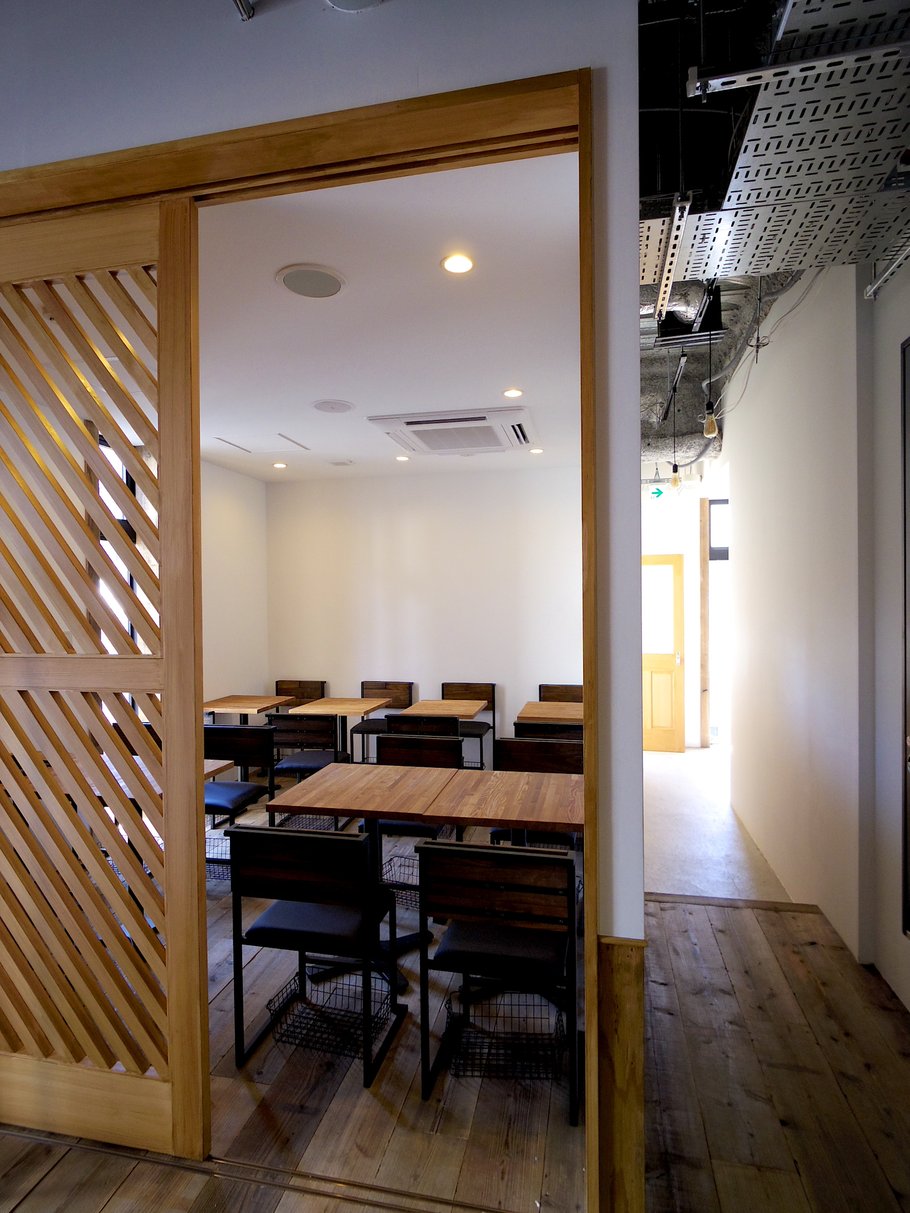 店内は大小の個室含め4種類の席を用意して、少人数から大人数での貸切、立食パーティなども可能。客席の一部の天井は鉄骨造の躯体を現しとして、仕上げ材として床には古材である足場板を、壁の一部にも古材のブリックタイルを使用。新築ビルのテナントでありながら、空間にヴィンテージ感を感じられるようになっている。