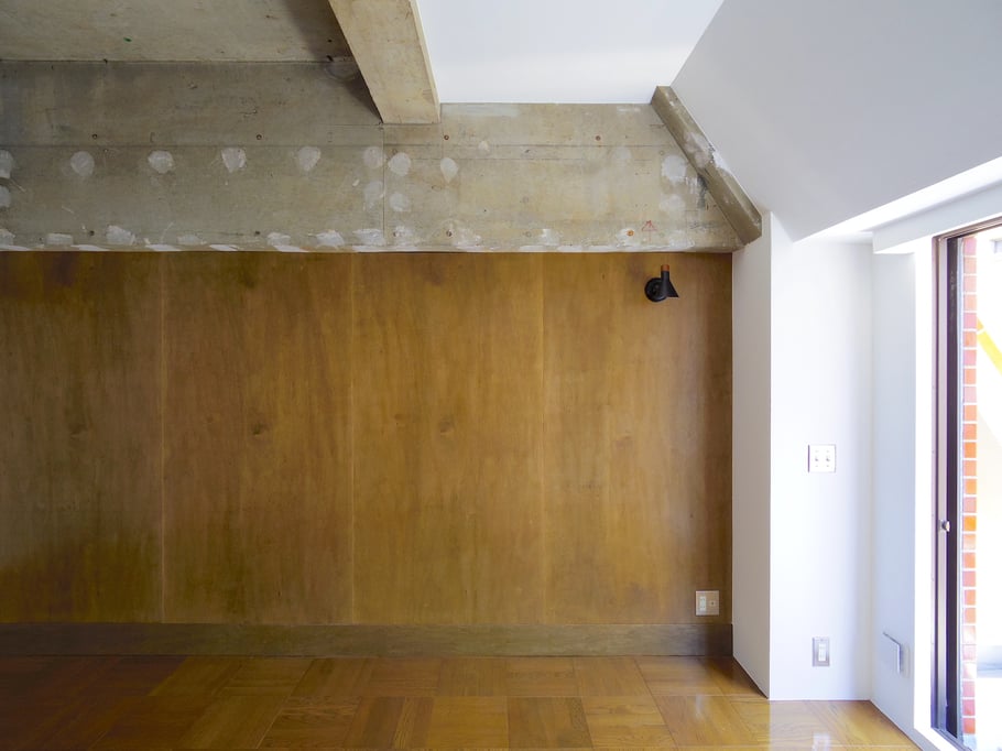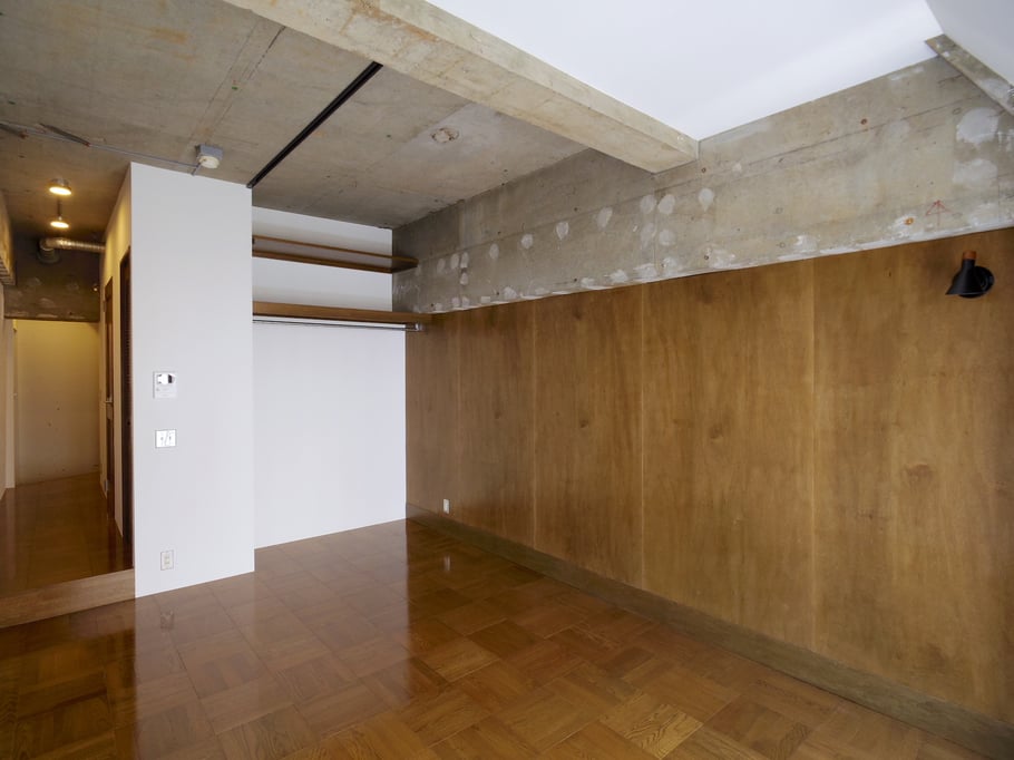 天井と梁を躯体現しにして、壁の一部に染色したラワン合板を貼り、床に同色の艶ありパーケットフローリングを使った空間は、ミッドセンチュリーのアンティーク家具のような仕上がりに。浴室・洗面などの水廻りを挟んでキッチンと居室部分を分けることで、ワンルームながらリビングのような居心地のいい居室空間をつくっている。